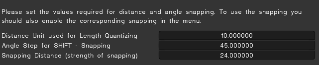 Snapping settings: Please set the values required for distance and angle snapping. To use the snapping you should also enable the corresponding snapping in the menu.