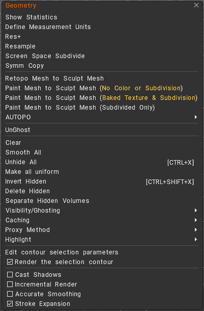 The Geometry Menu contains most of these functions, which include surface clean-up, creating proxy versions, resampling voxel resolution, voxel decimation, memory management, and many more.