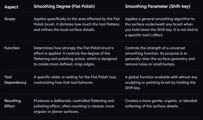 Rapid Smooth Scratches: This provides a similar effect that clay sculptors use to “rough out” surface features quickly. Draw scratches along the stroke. Scratches will fade existing geometry as clay.