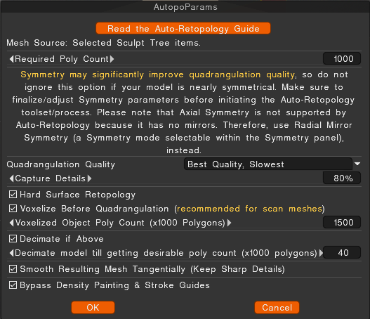 - Switching Voxelise Before Quadrangulation to OFF leads often to better quality. If you have snapping problems in the autopo mesh, then switch it ON.