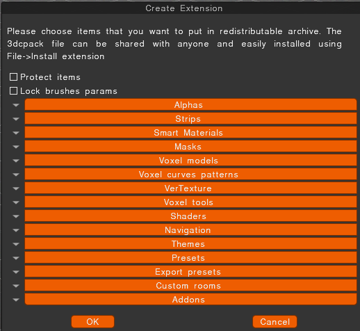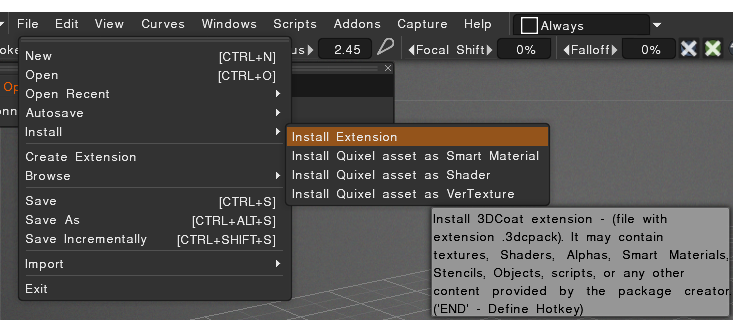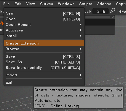 In 3DCoat, go to the File > Create extensions menu to start the process of packaging your assets.