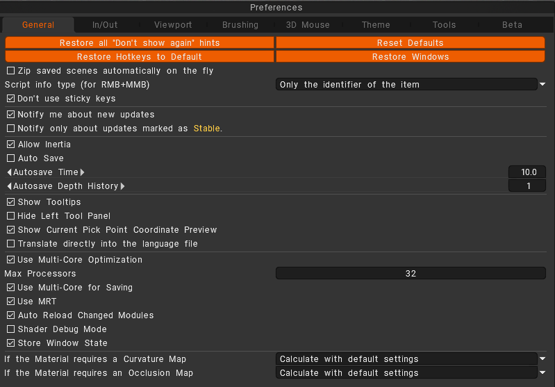 ShowBetaTools: We recommend that you always enable this option since 3DCoat is constantly improving with bug fixes and other updates. Seeing and using the beta tools and functions allows you to experience any new fixes and to get an advanced look at features that will not be present until the next major release of 3DCoat.
