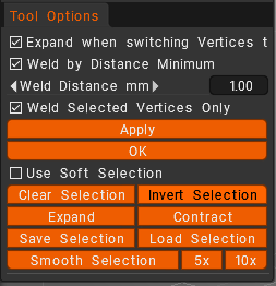 Weld Vertices: Welds selected Vertices within a pre-determined range in distance (in pixels). Colored Preview lines connecting vertices indicate which ones will be welded together.