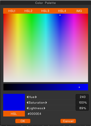 Press LMB to select new color. RMB to toggle color on or off (White is the default “off” color) and X to switch from foreground to background color.