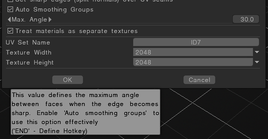 Grupy automatycznego wygładzania: Opcja „Grupy automatycznego wygładzania” umożliwia automatyczne tworzenie grup wygładzania. Określając wartość w polu „Maks. kąt” odpowiadającą za maksymalny kąt pomiędzy ścianami, gdy krawędź staje się ostra, konieczne jest włączenie opcji „Grupy automatycznego wygładzania”. Ta opcja zapewnia automatyczne UV mapping. O ile wynik jest zwykle zadowalający, niezmapowane lub złożone kształty wypukłe należy odwzorować ręcznie.