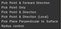 4. Pick point & direction (local): This will place the cursor at the last location you used the RMB, and its direction will be based on the single normal of the voxel your brush is centered on.