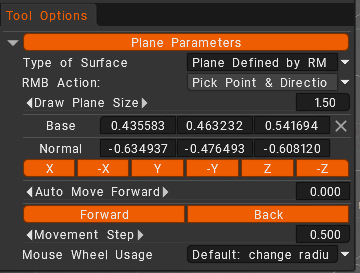 3. Pick point & direction: This will place the cursor at the last location you used the RMB, and its direction will be based on the average normals of the voxels that your brush covers.