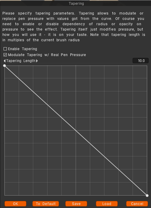 Taper Modifier: Tapering allows to modulate or replace pen pressure with values got from the curve. Of course, you need to enable or disable the dependency of radius or opacity on pressure to see the effect. Tapering itself just modifies pressure, but how you will use it – it is on your taste. Note that the tapering length is in multiples of the current brush radius.