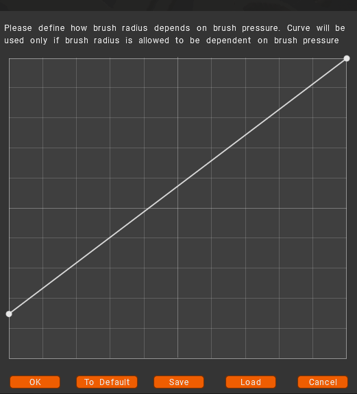 Define how the brush radius depends on brush pressure. The curve will be used only if the brush radius is allowed to be dependent on brush pressure.