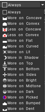 Select how depth, color and Gloss of your brush strokes are affected by colors, height and other parameters. Remember to set to “Always” when you finish using this option.