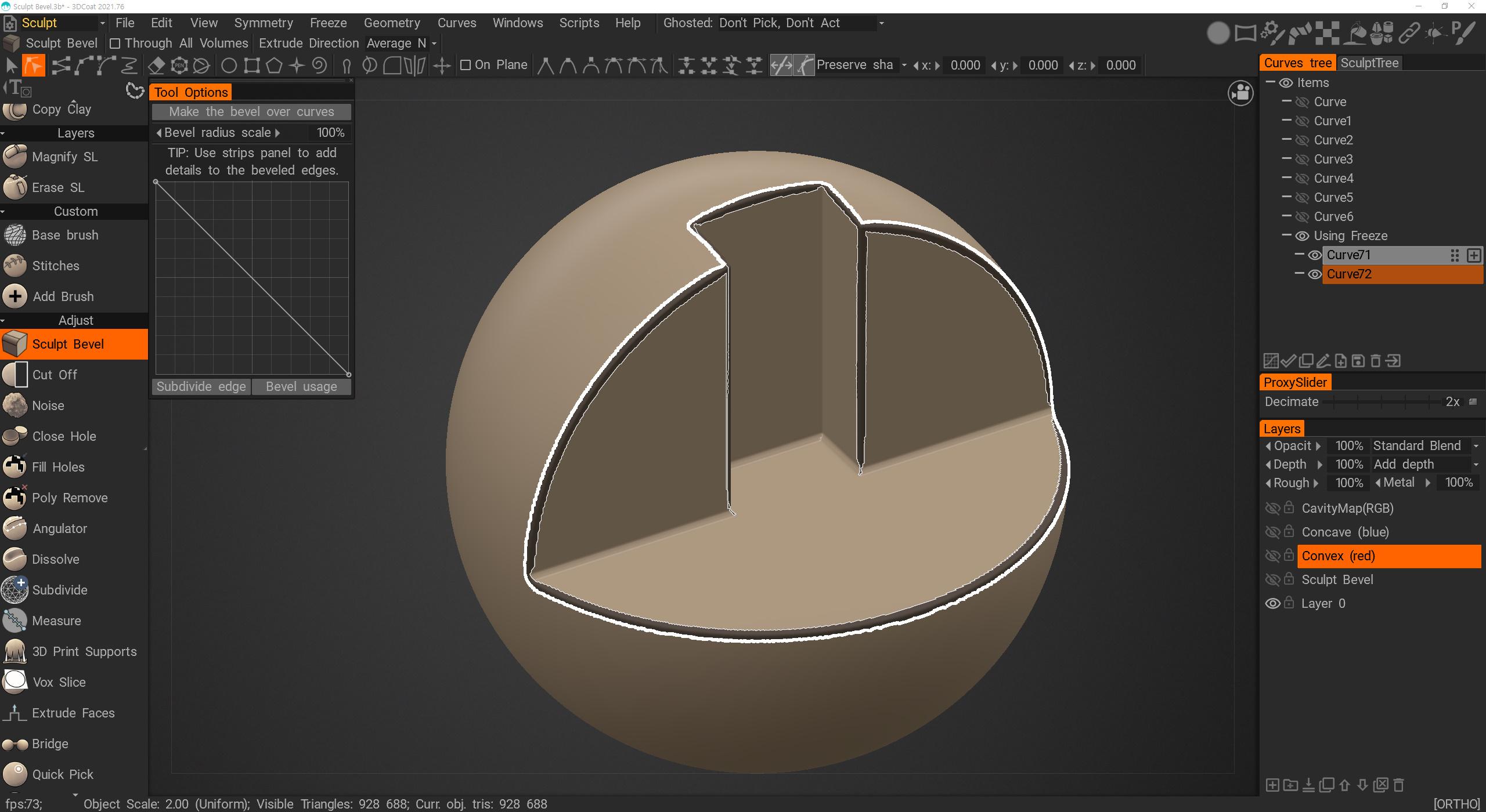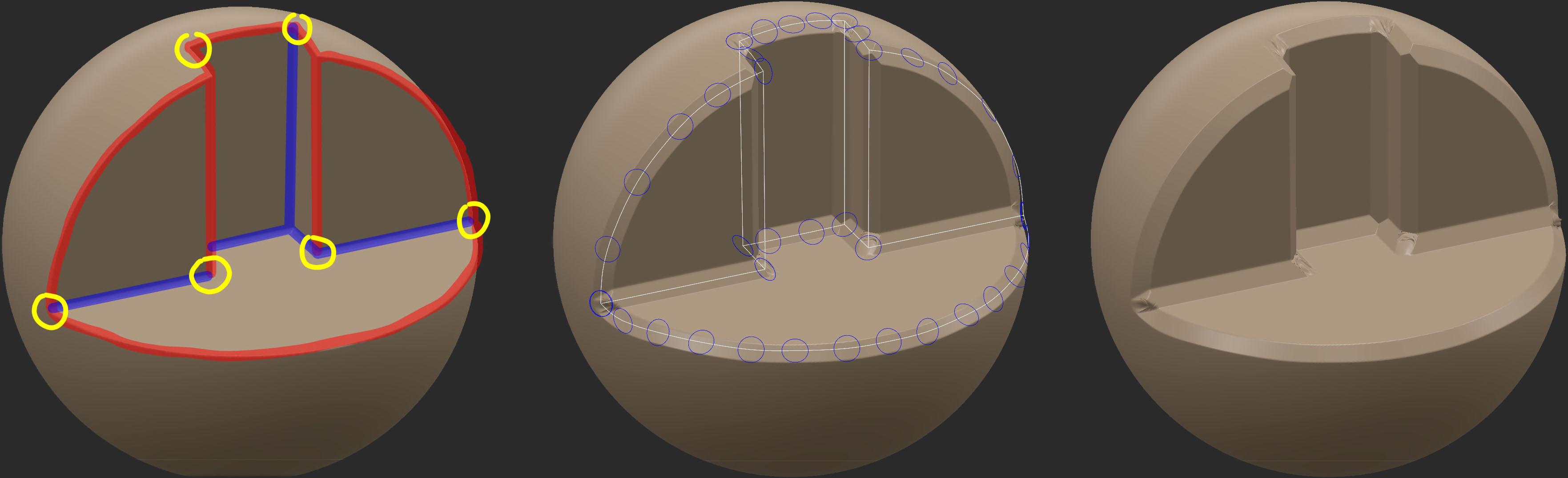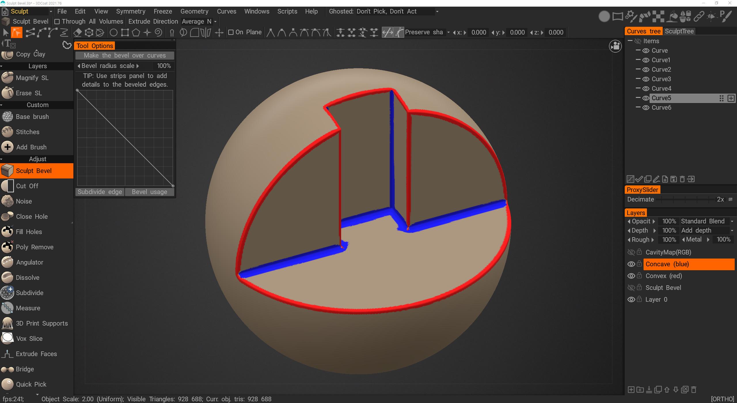 1. Can you improvement the corners of the Sculpt Bevel tool? Usually after doing a Sculpt Bevel, certain corners are ruined. - Not all corners are like that, but mostly... - Corners that bend outward - Corners that bend inward The point where these two corners meet forms a bad bevel. I attach an image here. The point where blue (inner corner) and red (outer corner) meet is distorted. Can you please improve it to get a little better result? 2. Can you create a curve by tracing the edge of the sculpting model? For simple corners, you can draw a curve yourself, but If there are many corners to beveled on, too much effort is required to create curves one by one. (Curve created using Freeze/Selection to curve) I tried to create a curve using Curve - Freeze/Selection to curve in the upper menu, but it is not created at the edge and the result is not good. I heard that @Andrew Shpagin recently developed an algorithm that finds edges by improving the Retopo algorithm. Can you use that technique to create this curve? Created using the edge of the Sculpt model Create a curve by finding an edge within the mask(freeze) area This looks especially cool when working with RGB Curvatures. You can create curves from only the outer corners or only the inner corners. This is a picture of painting the outer and inner corners using RGB Curvature. when this becomes possible - You can quickly create a curve. - You can quickly perform Bevel Sculpt with the created curve. - By placing additional models on the curve, you will be able to work with details such as frames. Here is the model file used to capture the image. (2021.76 version) Sculpt Bevel.3b