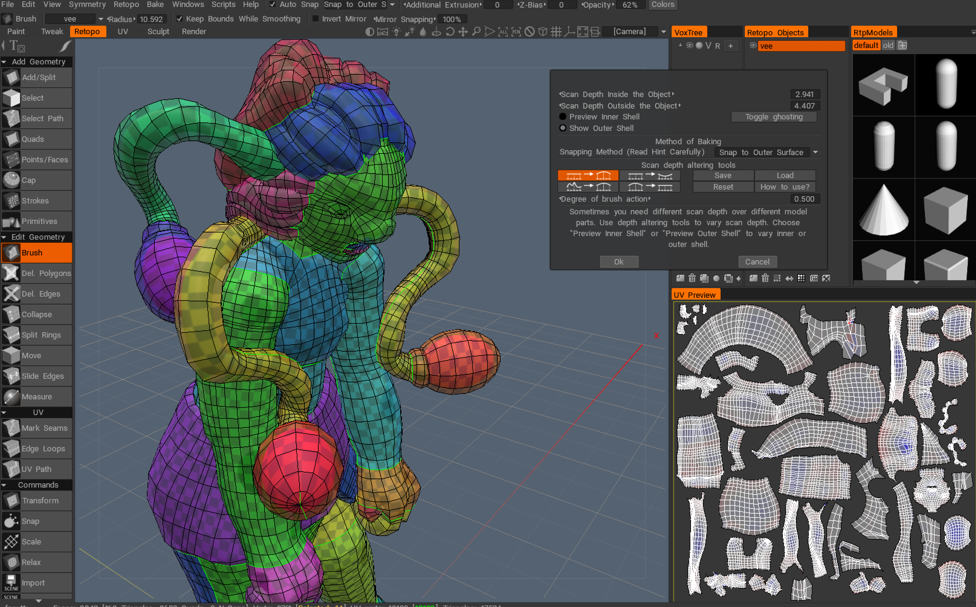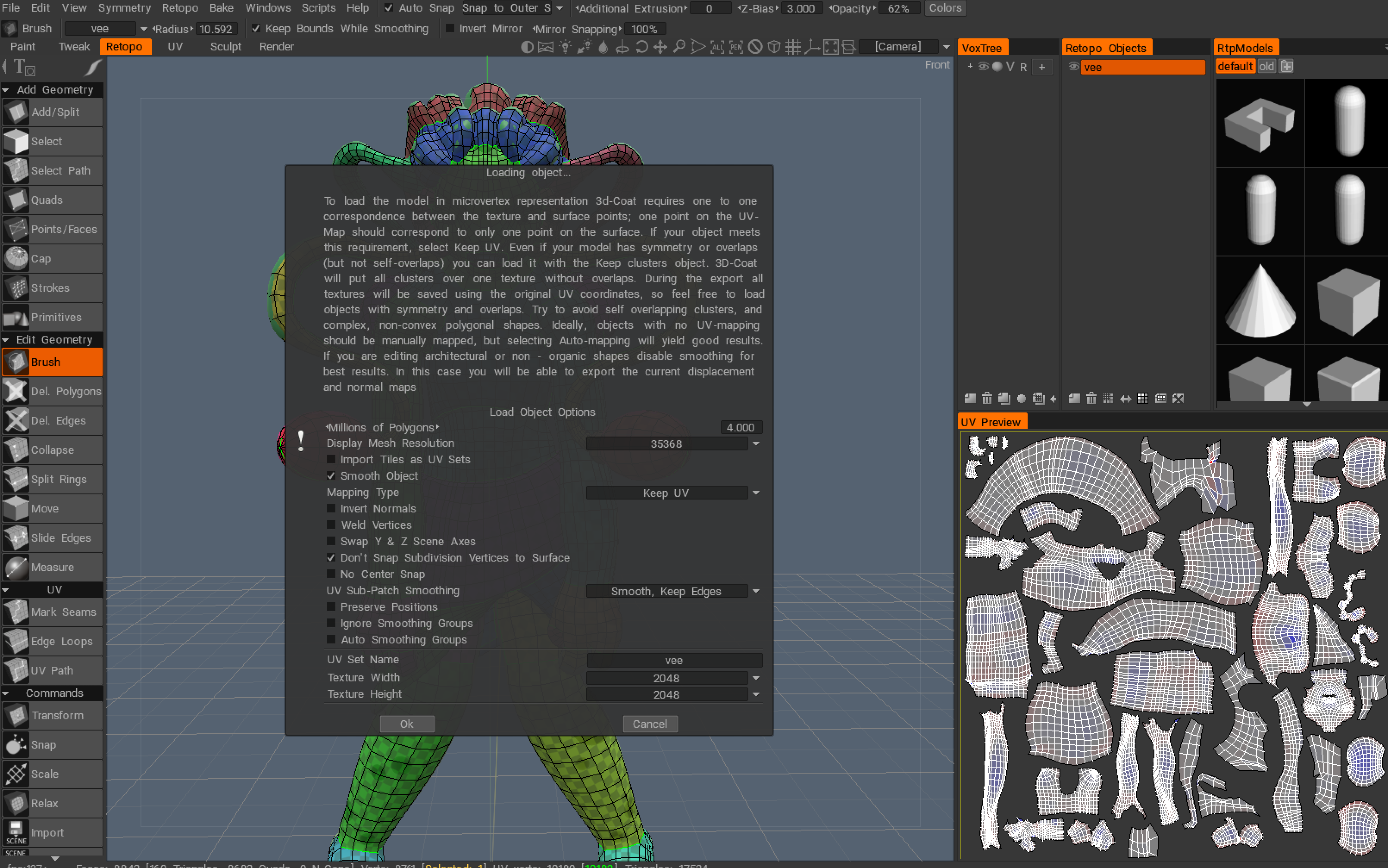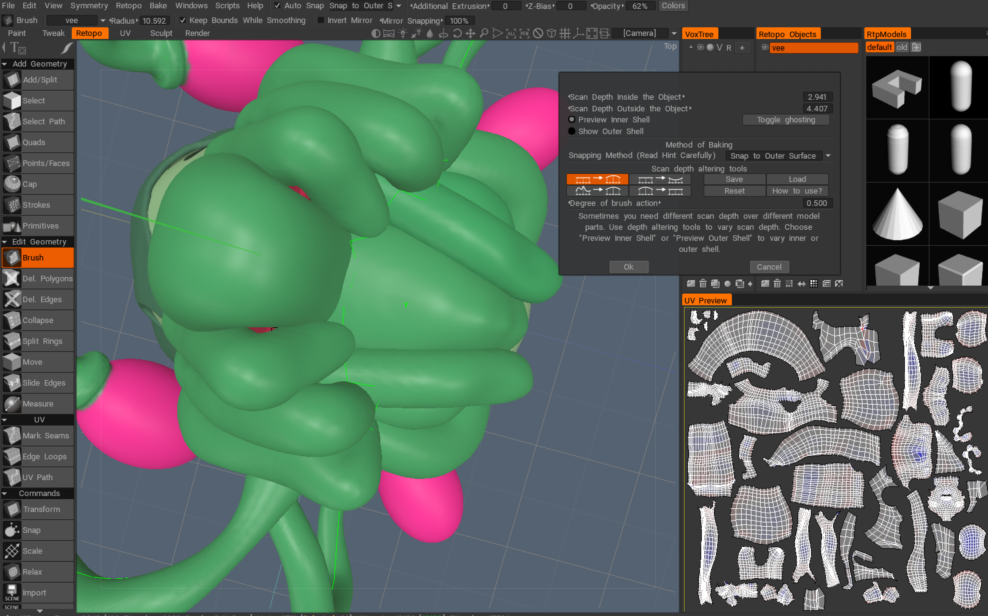 Member swampshell Posted March 26, 2018 Member Share Posted March 26, 2018 Hey all, I've been having some issues in 3D Coat when I attempt to transfer from the Retopo room, baking my retopology, to the paint room. I looked into several forums that I stumbled upon in my googling adventures and there are a few individuals who seem to have a similar problem, calling it a bug but not mentioning any possible solutions to the issue. However, I am uncertain to whether it is a bug or simply an error on my part. Here is what's happening. I start in the retopo room and go to bake the object using Bake into scene (microvertex). I then adjust the outward mesh, then I work on the inner part. I've found that in order to get more of the internal from being visible I must use the brush tool to adjust the depth (rather blindly). BUT, after a certain amount of time there are still points in which I cannot get to hide. Once I've done what I can manage I continue on. (note: the image below does include the settings I've been using, but I've also tried upping it to 4K which doesn't seem to help any) Now, once I get to the paint room I've discovered that numerous chunks of my model are broken and littered with transparent scars. This is not the first time this has happen to me. However, last time I could fix it by creating a new layer and using the brush to fiddle with the depth (which essentially covered/erased the marks). This time though, it's not helping. Is this some sort of bug? An error on my part? If it is a fault of my own, does anyone have a suggested solution? Quote Link to comment Share on other sites More sharing options...