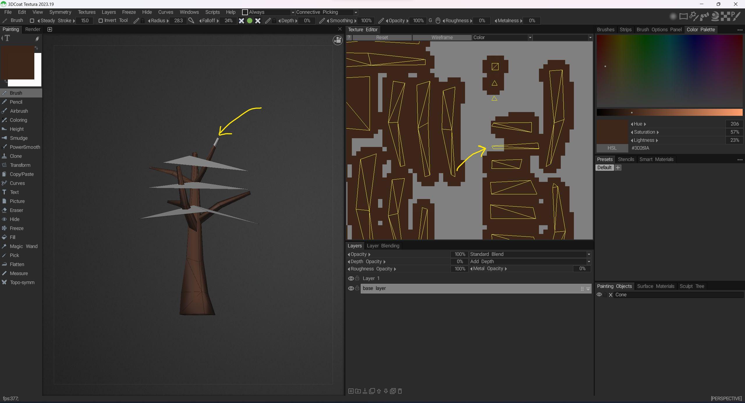 This has happened with almost every mesh I have exported, but as an example see this tree model. The grey on the branch there is the base color of Layer 0, and the brown is what I have painted in the 3D view (and tried in the 2D view). Notice the end of it just won't paint!