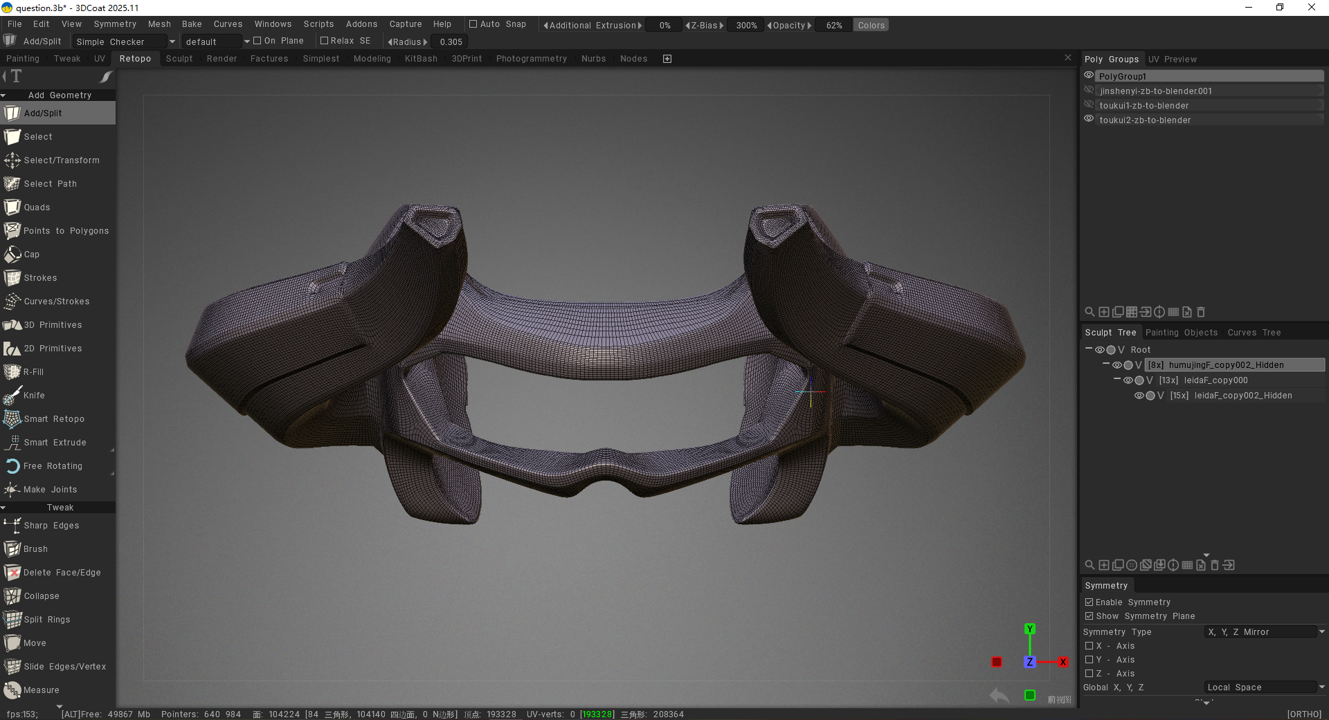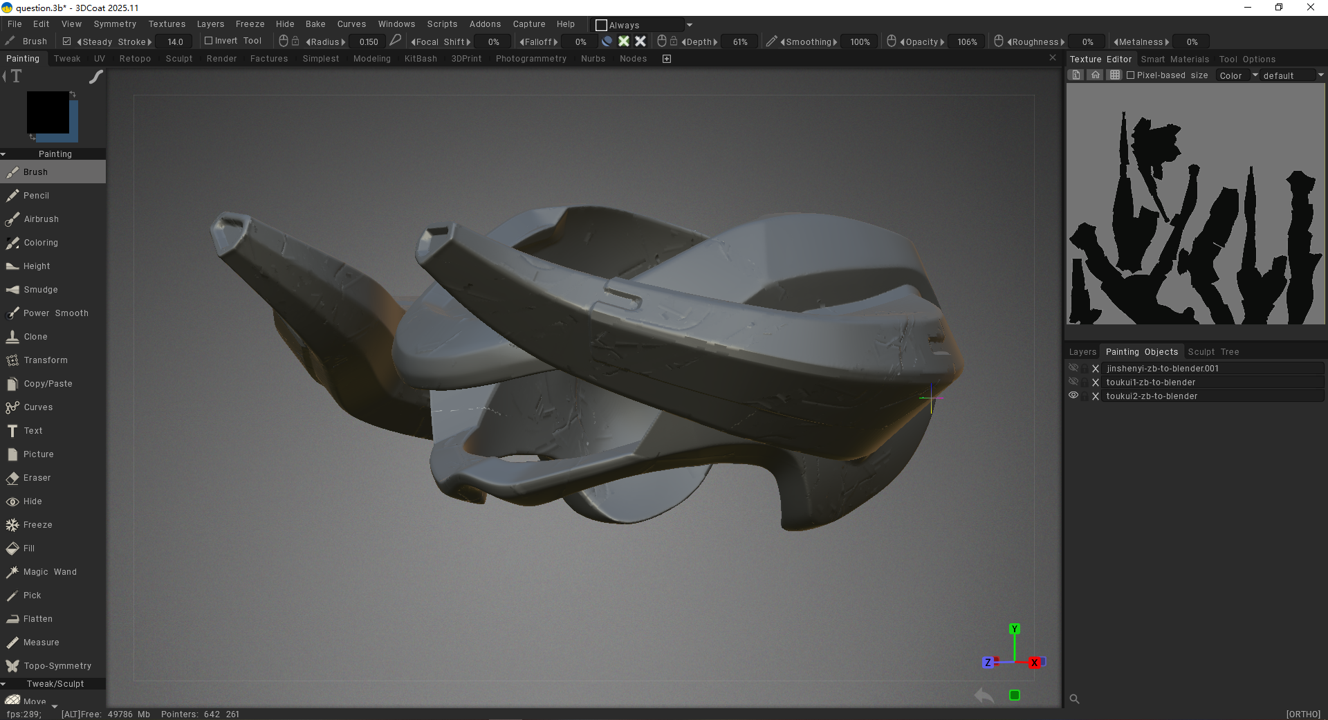 Member tat2charmander Posted Thursday at 08:29 AM Member Share Posted Thursday at 08:29 AM Help needed! I used Bake with Normal Map in the Retopo Room, but after the baking process finished, I noticed in the Painting Room that the resulting normal map is completely broken. Additionally, after running Calculate Occlusion, some parts of the model turned black. I’m not sure whether this issue is caused by problems with the model itself, or if I made mistakes during certain steps of the workflow. The high-poly model was fully sculpted in 3DCoat. The low-poly model was generated by exporting the high-poly mesh to another software for automatic retopology, then slightly edited in Blender, and finally re-imported back into 3DCoat. I initially tried using 3DCoat’s built-in AutoPO, but the topology quality was not satisfactory, which is why I switched to a different retopology solution. Before this bake, I had already successfully used Bake with Normal Map on two other models without any issues. This problem only occurred on the third model. Because my .3b file is too large to upload, I will instead provide relevant screenshots to help illustrate the issue. Quote Link to comment Share on other sites More sharing options...